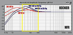 Kicker традиционно щедр и либерален, когда дело доходит до рекомендаций по оформлению: ЗЯ от полусотни литров до полутора сотен плюс два «фазика», тоже сильно неодинаковые. Получающиеся АЧХ — перед вами, комментарии излишни. По нашим данным, у головки значительно больший, нежели предполагалось, эквивалентный объём и более низкая полная добротность. По расчётам это нам на руку: идеальным объёмом ЗЯ оказывается 23 — 25 л, Объём фазика с наиболее разумной АЧХ 40 л, частота настройки 32 Гц. Правило EBP работает, акустическое усиление у фазоинвертора ниже, чем у предыдущих участников.