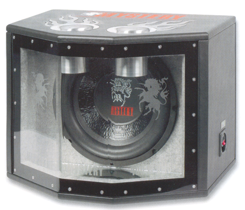 В сегодняшней подборке это первый сабвуфер в оформлении полосно-пропускающего типа (пусть будет Bandpass — это то же самое, только не по-нашему). Вместе с корпусом из MDF сабвуфер весит изрядно. Это притом что верхняя и нижняя стенки несколько тоньше всех остальных. Толщина оргстекла передней стенки, согласно описанию, ю мм (чтобы проверить это, нужна была дрель, а это могло быть неправильно понято). Внешнее покрытие — не какой-то карпет, а винилискожа. Алюминиевые полированные трубы (75 х юо мм) с «языками пламени» вокруг — загляденье. Плюс ещё двухцветный полиграфический логотип фирмы. В общем, призма Mystery выглядит явно дороже своих денег. А тут ещё синяя неонка, которая подсвечивает всю эту красоту изнутри. Винтовые зажимы установлены на задней поверхности, а зажимы для питания подсветки — на правой стороне корпуса, если сабвуфер смотрит на вас прозрачной стенкой.