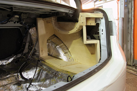 Машине пришлось провести полную шумо- и виброизоляцию, также понадобилось в некоторых местах произвести работы косметического характера, больше всего в этом нуждался багажник. Под картетом блестел голый металл, да и сами формы не радовали глаз. Местами производители и какпет пожалели – часть полки, служащая потолком багажника, и внутренняя плоскость крыши багажного отсека демонстрировали свои ребра жесткости. Мы устранили эти недоразумения, и добились законченности всего багажного отделения. Теперь он смотрелся единым ансамблем.