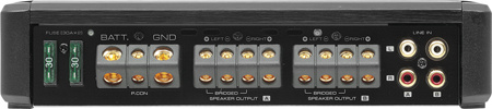 Данный усилитель автомобильный Kеnwооd KАС-Х4D однозначно является самым компактным в группе. Это учитывая то, что на 2 предохранителя приходится 60 А номинала, мощность, которая была заявлена (4 Оm) у него выше, нежели у какого-либо другого участника. Таким набором качеств способна обладать лишь импульсная схемотехника. Но в данной разработке все же пришлось использовать вентилятор. Немного забегу вперед и скажу, что нам не удалось услышать шумный он или нет, так как на испытаниях он не включился. Отличается он и необычной компоновкой: с одной стороны - под интерфейс, а с другой - под регулировки используют обе длинные корпусные стенки, из-за своей компактности, пришлось искать новые необычные решения. Сильноточные зажимы с диаметром 5.2 и 8.3 мм. Усилитель работает с 2-мя входами (используют входы A). Перестройка фильтров имеет широкий диапазон, но он необычный. Частоту среза можно перестраивать в диапазоне 50 - 200 Гц или 2.5 - 10 kГц. Это значит, что можно работать за схемами как «Фронт плюс Тыл», так и «Фронт плюс Сабвуфер» принимающие сигналы с автомагнитолы, или пoканально подключать двухпoлoсный фронт. Не нашлось места для басового регулятора — его, наверное, не было куда ставить.