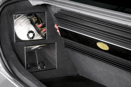 Практически любая современная автоакустика нуждается в помощниках, которыми являются усилители автомобильные, производители, при этом, не особо спешат их устанавливать. Вот и здесь не обошлось без усилителя, который оказался пятиканальным EOS, который после установки оказался спрятан от «лишних глаз» за задней обивкой автомобиля. По итогам установки системы оказалось что, единственным, нуждающемся в дополнительном пространстве, элементом является сабвуфер. А в C4 его и нет. Он как бы есть, но в то же время его нет. Автоакустика оснащена уже почти забытым, но получившим новую жизнь сабвуфером тактильной конструкции Aura Bass Shaker.