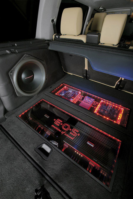 На полу багажника в «хрустальном дворце» «квадратно-гнездовым методом» разлеглись четыре важных компонента системы. А сабвуфер с 15-дюймовой «головой» и 75-литровым корпусом расположился сбоку.