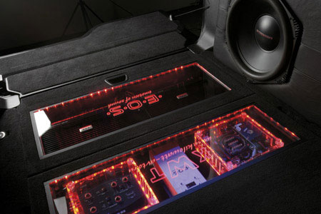 «Хрустальный дворец»: под гравированным толстым стеклом, подсветкой и другим прочим располагаются квадратно-гнездовым образом усилители автомобильные, системный компьютерный блок и звуковая карта. Здесь же потенциометр самого главного регулятора громкости и буферная емкость. Оживает это все от единственного касания к главной кнопке…