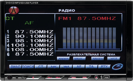 Тюнер АМ данной автомагнитолы имеет два банка пресетов. Выбирая в настойках тюнера Россию мы видим что банки тюнера ЧМ отводятся автоматически под нижний диапазон. Чтобы заполнить все банки придется подождать 15 секунд. Режима ожидания здесь нет.