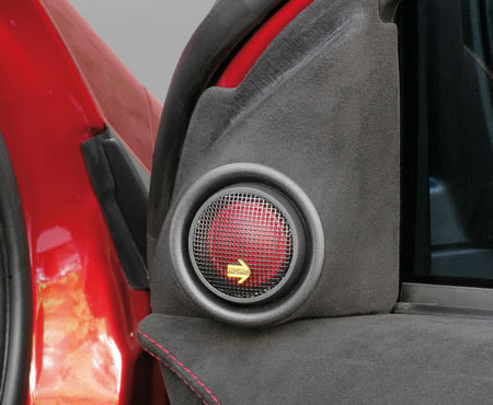 Наш Константин выбрал для аудиотракта (с одобрения заказчика) компоненты марки Polk MOMO. Наиболее подходящие, как считал автор проекта, оптимально для этой аудиосистемы и по эстетике, и по характеристикам. Попавший под моторный тюнинг автомобиль стал очень громким, поэтому для эффективного противоборства аудиосистемы с выхлопной системой требовались приличные запасы звукового давления системы. Polk MOMO подходили для этой цели, однако для надежности решено было использовать схему сдвоенных мидбасов. В обе передние двери вставили по 2 6,5-дюймовых головки, принадлежащие комплекту MM6. Чтобы им не стало вдруг скучно, головки параллельно соединили и получившуюся нагрузку (она вышла двухомной) передали двум каналам отдельно стоящего усилителя Polk MOMO CЗ00.2. Это вышло очень даже соответственно - серия Carbon.