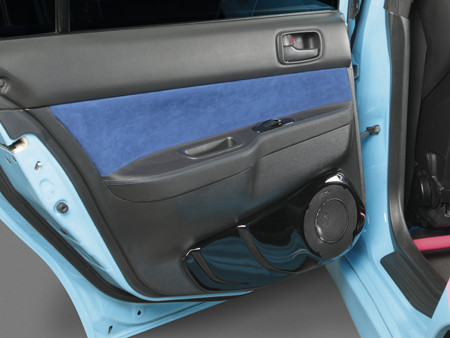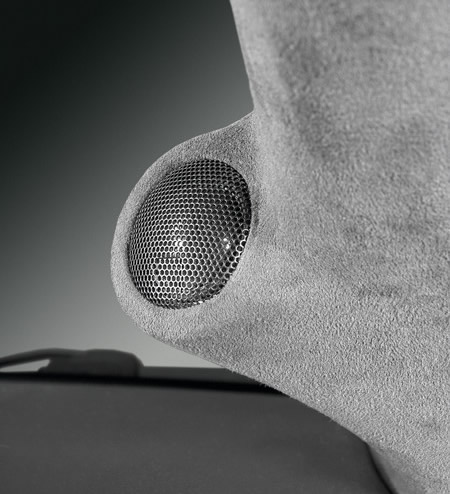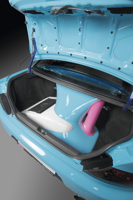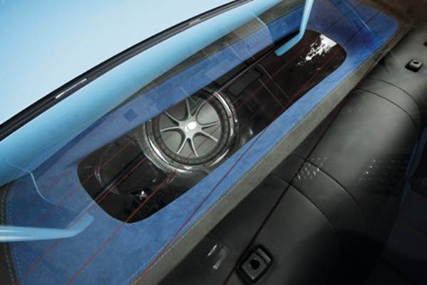 Непосредственно на корпусе сабвуфера стоит басовый моноблок, закрытый декоративной крышкой, гармонично сочетающейся с очертаниями корпуса. Крышка также была изготовлена по «чулочной» технологии. Дистрибьютор питания и четырехканальный усилитель спрятаны между арками задних колес в глубине багажника.