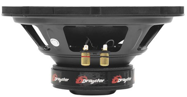Сабвуфер автомобильный Dragster оснащен составным диффузором: полипропиленовый сегмент – сверху, снизу – полноразмерный целлюлозный конус. Подвес шириной 27 миллиметров. Не звонкая корзина, у «десяток» проблемы с этим возникают очень редко. На внешнем корпусном ободе имеется уплотнительное высокое кольцо, сделанное из губчатой резины. Конечно, для того, чтобы оно уплотняло, головку необходимо монтировать в ящик методом «изнутри», а занимается этим мало кто, или же «все снаружи», что чаще встречается. Не крупный магнит, внешний диаметр которого 120 миллиметров. Осевое отверстие обладает диаметром 30 миллиметров, что достаточно смело при простом размере катушки звука. Здесь также винтовые контактные зажимы. К катушке провода проходят по 3-му способу, их пришили к центрирующей шайбе.