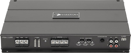 Автомобильные усилители Phantom этого вида наверняка показались вам знакомыми, не удивительно: его близкий «сородич» (PSA 2.120) принимал участие  в нашем тестировании год назад. Сборка аппарата, как мы уже сказали, «итальянская» — есть такие (даже довольно много) варианты монтажа, для которых такая конструкция приемлема. На зачищенный кабель рассчитаны силовые зажимы, калибр кабеля может досягать до 0,6 см. В том случае если подводится питание это не лимит мечтаний, хотя и позволительно. Итоговый номинал предохранителей 50000 кА — это уже что то. Автомагнитолы  такого вида как Phantom PSA 2.200 имеют как входы высшего уровня, так и линейные выходы. В собрание поставки даже предусмотрен дистанционный регулятор, который регулирует автозвук, а точнее его уровни, такой отличительной чертой могут похвалится лишь два участника в нынешней группе. Буст ступенчатый, но он имеет две ступени — 6/12 дБ. Центральную частоту на автомобильные усилители производитель не указывает. Фильтры НЧ и ВЧ отлаживаются по отдельности, интервал перестройки у них одинаковый — 50000 — 250000 кГц.