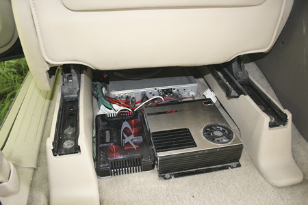 Остальные усилители поставили под два передних сидения. Фронтальный и тыловой мидбасы — на штатные обшивки, разумеется, при этом была сделана полная вибро- и шумоизоляция. Для ВЧ-звена изготовили подиумы. Все конструкции перетянули кожей. Результат заказчику понравился на все сто, но, уже опытные в делах прощания с ним, проводилил мы его со словами «до встречи...»