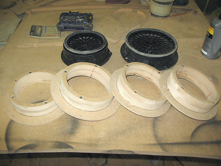 Чтобы сабвуферы поместились в заднюю полку пришлось вырезать соответствующие по размерам отверстия, а сами головки разместить в панели, сделанной из двух слоев MDF со специально созданными шпангаутами, вдоль которых вклеивалась стеклопластиковая скорлупа