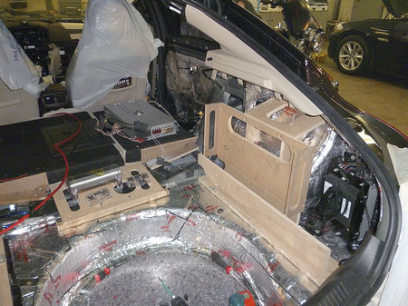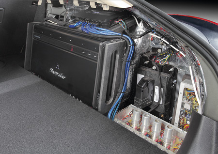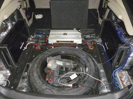 Что касается монтажа системы, то вся основная автоакустика наглядно представлена на фотографиях, все остальные компоненты системы спрятаны в багажнике. В нише справа поместили усилитель СЧ/ВЧ, ламповый драйвер, процессор, а слева – мидбасовый усилитель. Буферная емкость и усилитель сабвуфера также находится здесь.