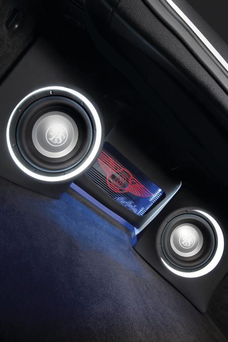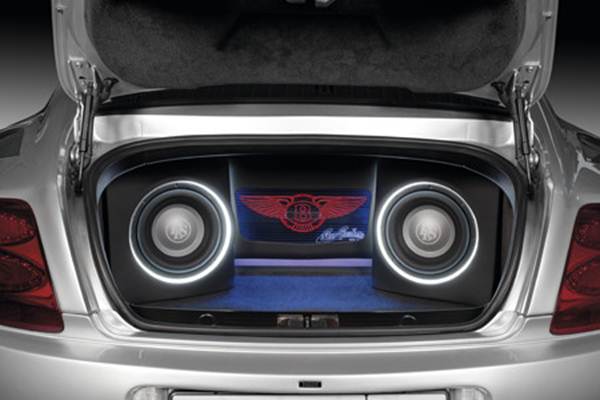 Для удобства компоновки в системе два автомобильных сабвуфера DLS Nordica 10. Необходимый басовый потенциал подразумевает 12-дюймовую головку, однако площадь диффузора у двух 10-дюймовок будет, разумеется, больше, чем у одной 12-дюймовки, да и устанавливать в багажник их удобнее. Они устанавливаются по бокам багажника в довольно объёмных (примерно 20 дм3) закрытых корпусах с разворотом. Нельзя не отметить и оригинальный дизайн сабвуферов – у них есть подсветка с полоской оргстекла. Вся конструкция собирается наподобие некой «матрёшки»: вначале сабвуферы, затем в середине монтируется блок усилителей, который закрыт стеклом с нанесёнными на него логотипами – и Bentley, и, конечно, Car Custom Club. Благодаря тому, что тонированное стекло – двойное, – каждый логотип можно подсветить разным цветом.*