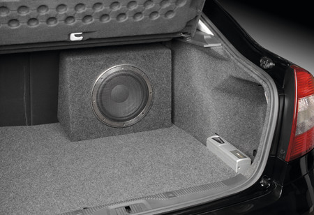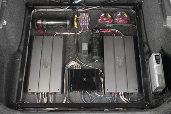 Наконец, сабвуфер. В багажник устанавливается головка (10'') BRAX Matrix 10.1 в объёмном (около 30 дм3) закрытом корпусе. Разумеется, фазоинверторов здесь нет, ведь система оптимизирована под живой звук. Однако не все фильмы – музыкальные, не вся музыка – классика... Вдруг потребуется адекватно передать шествие слонов на водопой? Именно из этих соображений был выбран объём акустического оформления – около 0.8, чтобы получить золотую середину между «киношными» и «симфоническими» настройками. Вместе с сабвуфером в багажнике устроились и остальные компоненты системы – усилители и процессор.