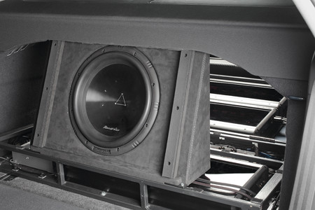 Сабвуфер модели Phoenix Gold Ti212d4 монтируется в корпусе закрытого типа, а его объем определяется кубическим футом. Располагается он за задним сиденьем. Корпус изготавливается из MDF, но достаточно затейливо — изогнутые стенки боков существенно крепче плоских. Сам корпус сабвуфера монтируется к сварной раме, во внутренней части которой располагается один усилитель, драйвер дампового типа с индивидуальным питанием и процессор. Вторая составляющая рамы — поднимается посредством газовых упоров. В ней содержатся пара усилителей, а под ней запасное колесо.