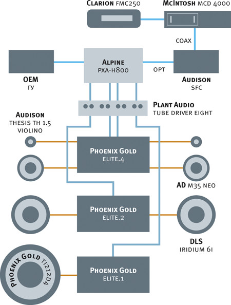 Для проекта подобного уровня сама структура аудиосистемы не обсуждалась. Фронт на три полосы с полным по канальным распределением и сабвуферы автомобильные, процессорный тракт, ламповый аппарат известной на всей планете компании Phant Audio. Естественно, без продукции данной компании за последний год трудно представить хоть единую, в действительности стоящую студийную работу.