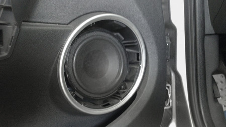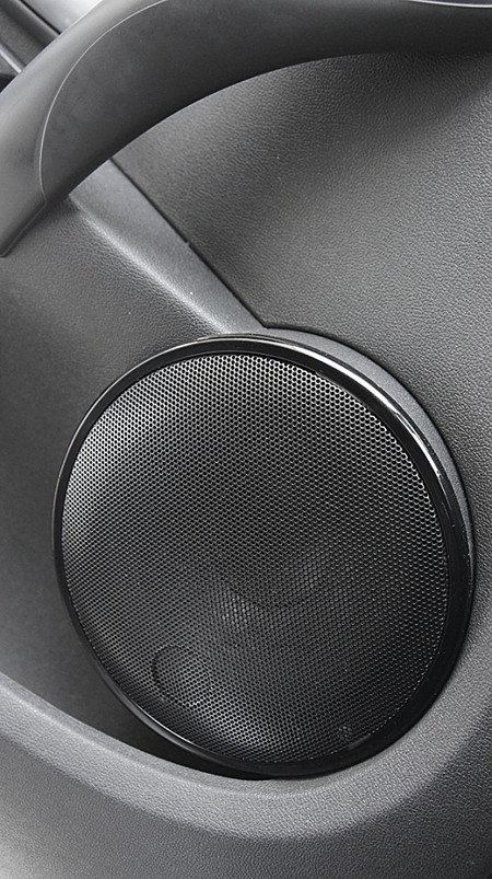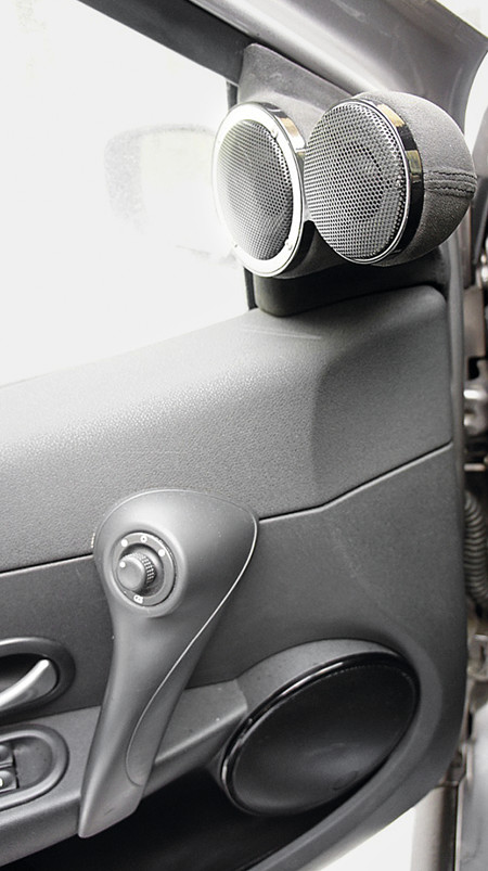 Прикинув различные варианты расположения ВЧ и СЧ, решили, что будет оптимальным поставить их вблизи, в виде 8-ки на треугольниках боковых зеркал. На данном автомобиле они достаточно большие и должны отлично сочетаться с крупной конструкцией подиума. Единственное ограничение заключалось в отверстие воздуховодов для боковых зеркал, которые находились в торце панели приборов, было необходимо оставлять место для того, чтобы проходил воздух. В качестве основания были сделаны на заказ «восьмерки» из алюминия, они были закреплены при помощи перфоленты к треугольникам для отслушки и подбора оптимальной ориентации. Затем чтобы придать подиуму необходимую форму использовали модельный пластилин. Получив необходимый результат, применяя полиэфирку и стекломат, увековечил в стеклопластике подиум. После доведения его до ума шпатлевкой и наждачкой, пришлось затянуть алькантарой. Элементы из пластика передней панели, кольца сеток и «8-ки» для соблюдения стиля покрасили «рояльным» черным лаком.