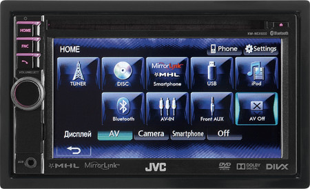 Нужно было просто ждать, когда данная технология придет в нашу отрасль и кто станет первым. В нашей редакции первым стал JVC KS-NSX600 и JVC KW-NSX700EE (имеет семидюймовый экран), интеграция данного устройства со смартфонами превосходна. Кстати, прибор не самых дорогой, что радует в любом случае. MHL-вход реализовали гнездом Micro USB B, поставка комплектуется соединительным кабелем с таким разъемом. (Наверное, кто-то заметил, что один из участников рубрики «Ринг» данного номера имел разъем Micro USB B, но нам не была известна информация о его назначении). Поэтому оставалось только выбрать мобильник с поддержкой MHL-стандарта и таким соединителем. По имеющейся информации, поддержка стандарта есть у многих моделей Sony, LG, HTC и Samsung. Такой же MicrоUSB интерфейс применяется при соединении по MirrorLink, выбирается протокол из меню настроек.
