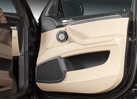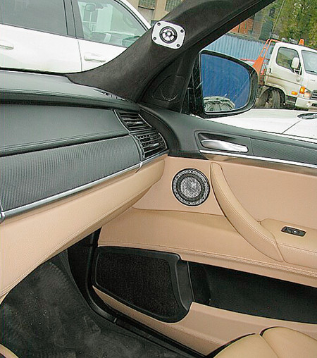 Монтаж среднечастотников проводился без архитектурных излишеств – вверху двери на плоскость и закрывались крупноячеистой акустически прозрачной сеточкой. Пищалки – наоборот, заглубленные частично в тело стойки и ориентируются индивидуально, мы просили выполнить отдельный снимок, на котором это было видно. На левой стойке внизу располагается управляющий пульт от радар-детектора Escort Passport, не относится к аудиосистеме.