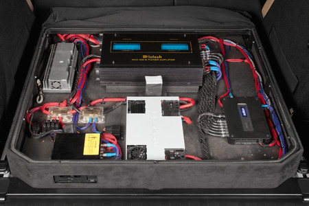 Все системные электронные компоненты устанавливаются в багажном отсеке на сварной раме под фальшполом. Плеер располагается для обеспечения удобного доступа выдвижного локтя для жестких дисков и слотам карты памяти. На приборную панель был выведен датчик, дистанционно управляющий плеером (предположительно, домашняя вещь, что плеер установлен и пыхтит под телевизором контентом, кто мог подумать, что его прописка будет в багажном отделе). А если покажется мало и терабайтника внутри, возможно подключение внешних устройств через USB-разъем 2.0 – выполнили вывод удлинителя разъема в центральную консоль. Кто бы мог предполагать, сэндвич с попкорном…