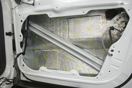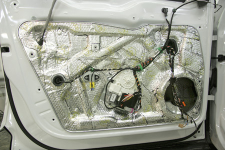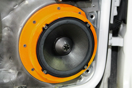 Монтаж автоакустики проводили стандартным методом: мидбасы в стандартные места через переходные колечки, пищалки – в треугольнички зеркал. Переходные колечки оранжевые, двери полностью вибродемпфированы.