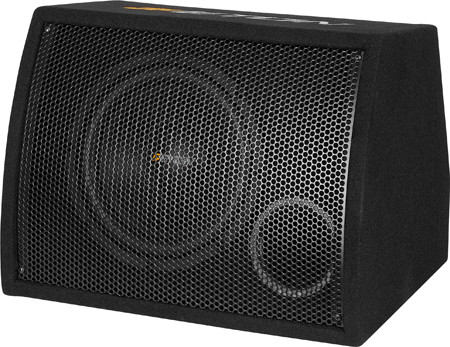 В корпусе пятиугольного сечения по параллельности размещены лишь боковые панельки, даже верхняя, но и та также скошена. На склонной передней стенке 10-ти дюймовый динамик и 80-ти мм порт ФИ. И весь динамик, и порт закрыты согнутой панелью из стального перфорированного листа