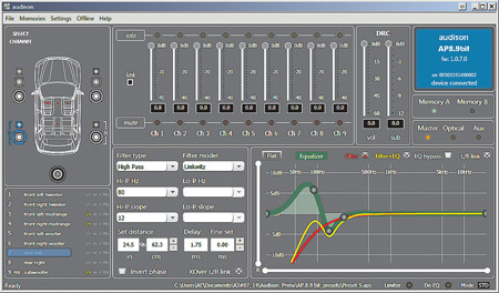 Сейчас можно создавать произведение своего искусства, для чего имеется все нужное: во всех канальцах набор фильтров, блок задержек во времени и 9-полосный параметрик. Это не учитывая такие мелочи как раздельная канальная рихтовка по чувствительности и бонусы – системы «разэквализации» при включении стандартной системе, динамический уровневый ограничитель, ячейки быстрый «субпресетов» - 2 настроечных варианта поля звучания при такой же конфигурации и абсолютный загрузочный сервис и пресетовой выгрузки. Тут просторно для вдохновения: возможна загрузка своих с компьютера или подключение из данного интерфейса к фирменным сервисам и осуществления поиска.