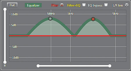А проявление эффекта переходов «2-горбой» в «1-горбую» кривую по настоящему. Так, как демонстрирует интерфейс пользователей. Т.е. система знает: при корректировке АЧХ на ближние частоты, вам требуется коррекция в отношении широкой полоски, и делает пересчет АЧХ-корректора. Кроме того, при сдвиге частоте ближе, процессором отключается 1 из полосок, а вторым снижается добротность для получения единой кривой. Приводится пример подобной интеллектуальной деятельности эквалайзера, все в результате выходит хорошо и плавно.