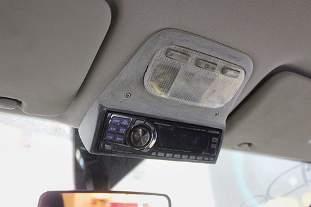 монтирован на потолке между козырьками от солнца на местах осветительных