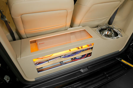 Во время конструирования решили наслаивать систему. Изначально была создана плоскость, для чего воспользовались щитом. Его расположили непосредственно за сидениями передними. Для того чтобы можно было активно эксплуатировать монитор, создали соответствующий механизм, который можно легко выдвигать. Кстати, для подготовки привода использовались компоненты, изъятые Nissan Maxima. Несомненно, в отношении винтов ходовых необходимо было произвести некоторые действия. Вертикальные стенки начинали формировать от подиума, дабы подготовить требуемый объем, в котором будет располагаться басовик, а также непосредственно холодильное оснащение. Дабы полностью сформировать холодильное оборудование, мастера приобрели соответствующие компоненты, а также привлекли спецов, которые бы смогли собрать все требуемые части.